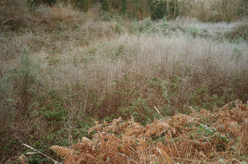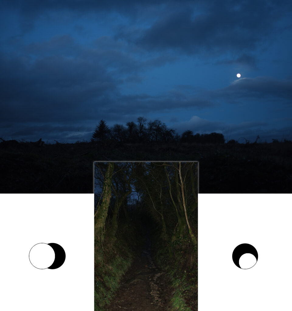 Je parcours le bout du monde avec excitation, cap de la chèvre, le Faou, forêt du Cranou. Une sensation de montagne me traverse quand je longe les bords du Rivoal. Puis les monts d’Arrée m’accueillent comme je l’ai tant de fois fantasmé, grisâtres, avec des bourrasques de pluie, fouettant le visage et contractant une peau déjà en alerte. Le sol est gorgé d’eau, de flaques gelées. Le jour disparaît ne laissant derrière lui que des teintes bleutées. « Bonsoir Lune »