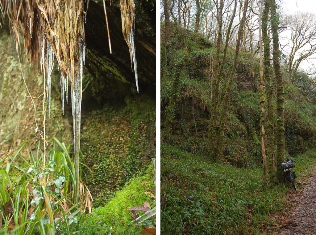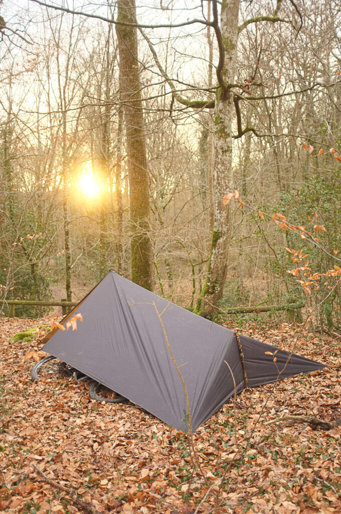 Après un bivouac glacial, je quitte ces contrées par les routes pour rejoindre la forêt luxuriante d’Huelgoat, équilibre parfait avec le désert des monts. Je ne m’éternise pas au chaos granitique, trop d’humains, et remonte vers le bois de la lande. Un espace plat, dans une pente, me paraît accueillant. Des billes de neige tombent subitement en début de nuit, ce qui recouvre partiellement la forêt sous laquelle je bivouaque. J’avais bien remarqué que les températures baissaient car j’ai peiné à réchauffer mes mains près du feu.