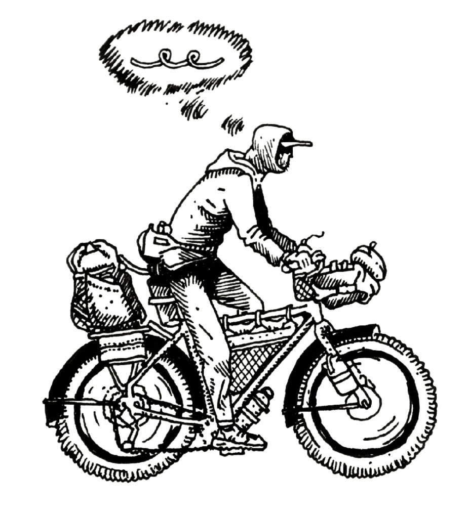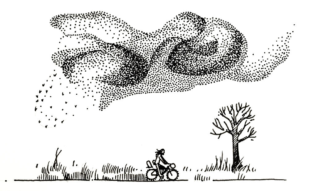 Passant sous une nuée de passereaux, le groupe m’accompagne sur une centaine de mètres, et pendant quelques secondes je suis avec eux. Porté par l’instant et la puissance du groupe, j’oublie tout. Puis la nuée vire et continue de danser plus haut. Je les remercie. Il est difficile d’expliquer concrètement ce que me procure ces expériences. Que ce soit sur ce vélo ou dans mes baskets, c’est sûr, j’aime être dehors. J’ai l’impression de me dissoudre et d’appartenir à l’environnement.