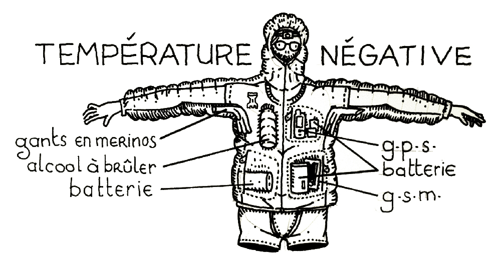 Au matin, j’entrecoupe le rangement du camp par de petites pauses ou je glisse les mains sous les aisselles. L’alcool à brûler que j’utilise pour mon réchaud passe quelques temps aussi au chaud, sous mon manteau. Ce liquide peine à prendre feu quand il fait trop froid. Ma veste abrite également toutes les batteries et appareils électroniques que je trimbale avec moi.