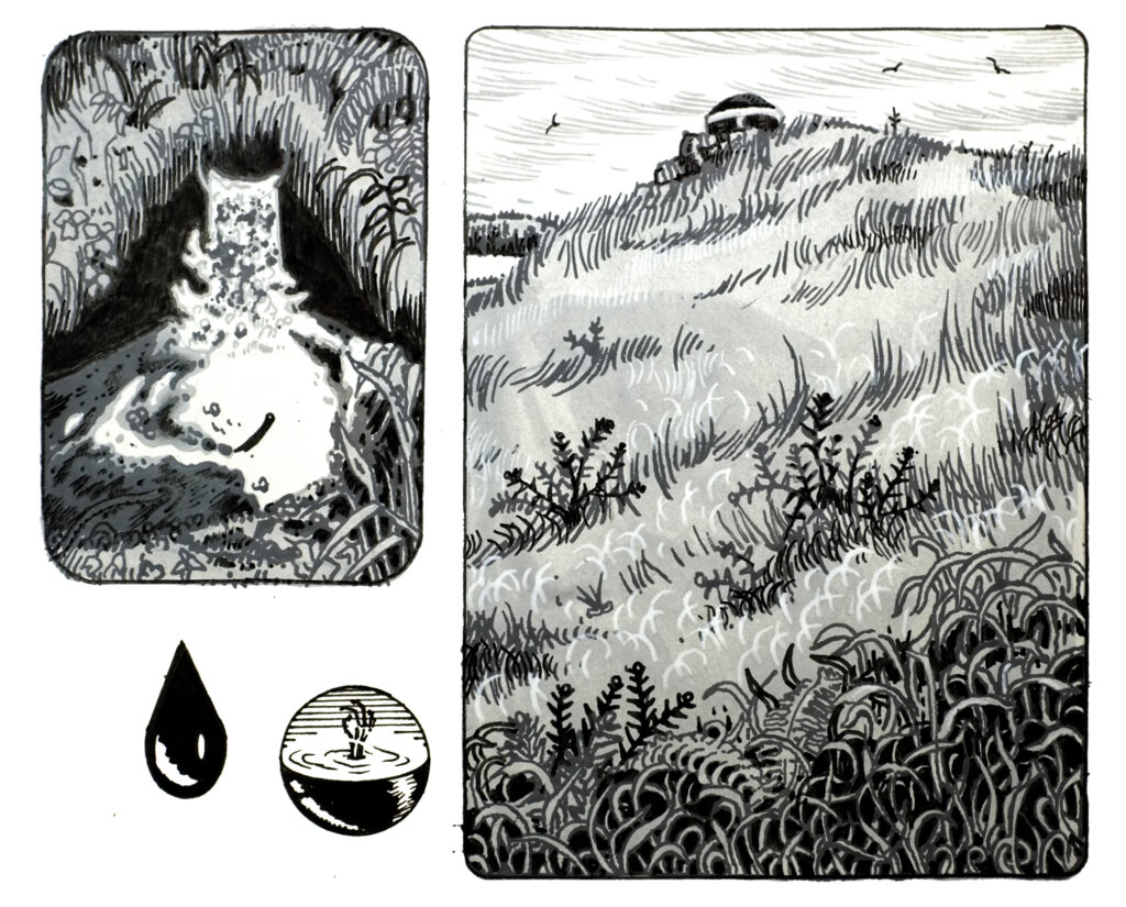 Cette pauvre monture ne supporte plus mes caprices et se traîne sur ces terres délaissées. Il y a bien ces récolteurs de tourbe qui fréquentent la bouillie au milieu de ce désert. Ce qu’ils appellent la bouillie est un méandre plongeant au fond de la terre et recouvert de boue. Des bulles de souffre jaillissent et éclaboussent, laissant l’impression de cuire dans la marmite du diable, le chaudron des monts !